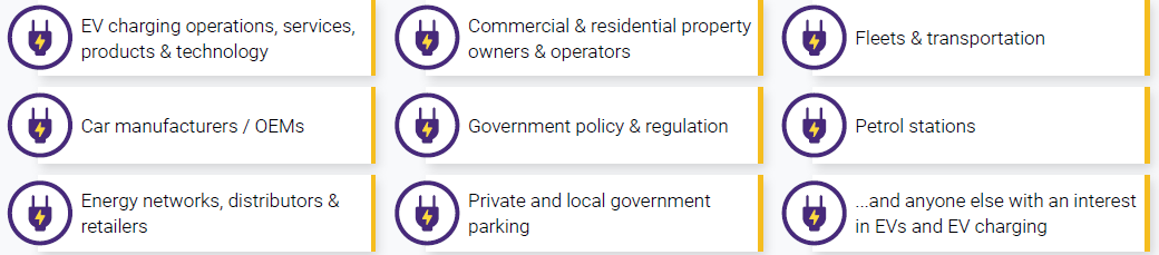 Attendees will include those in a management, team leader, senior, head, director or c-suite role related to EVs and EV charging in the following areas:
